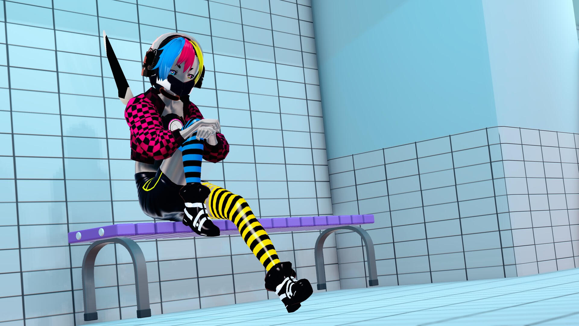 Kei-chan’s hair is made of plastic fibers. Its bangs are split into thirds of vivid cyan, magenta, and yellow, and the rest are bluish-grayish black.